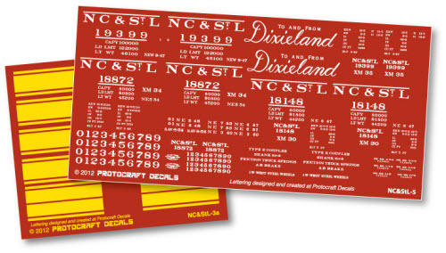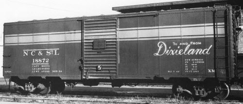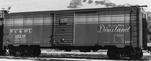 In May/June of 1937, the Nashville, Chattanooga & St.Louis Railway took delivery of 500 1932 ARA design 9’-4” IH steel boxcars, Class XM30. Built by Pullman-Standard, Lot 5561, and assigned Series numbers 18000-18499. In 1942, the Nashville took delivery of 500 10’-0” IH XM34 boxcars from Pullman-Standard, Lot 5694, Series 18500-18999. In September 1947, the Nashville took delivery of 500 10’-6” IH Class XM35 box cars from Pullman- Standard, Lot 5866, Series 19000-19499. Introduced in 1947, the striking imitation gold band and new script Dixieland scheme lasted to the merger with the L&N in 1957. ![]() ![]() ![]() Background color shown above is not included in decal sheet |