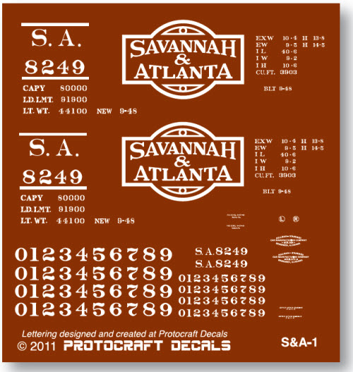 In September 1948, the S&A took delivery of 50 PS-1 design boxcars from Pullman-Standard, Lot 5896A. These came equipped with Andrew trucks and were assigned Series numbers 8200-8249. In December 1953, Pullman-Standard delivered 300 additional cars, Lot 8151, given Series numbers 500-799. Later in May 1956, Pullman delivered an additional 300 cars, Lot 8284A and assigned Series numbers 200-499 Lettering set designed and created at Protocraft Decals ![]() Background color shown above is not included in decal sheet |