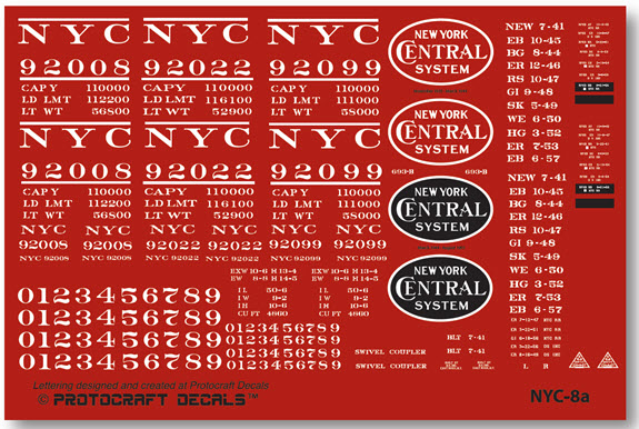 ![]() In July 1941, NYC’s Despatch Shops built 100, 50’ boxcars with an 8’ side door and an end door, under DSS #772B. Classified as NYC’s Lot 693-B and assigned road numbers as Series 92000-92099. These constituted the NYC’s only 50’ cars with end doors. The specific use for this order has not been found, perhaps aircraft bodies or wings, but later some cars had their roofs raised to accommodate oversize cargo. With the maximum approved AAR height of 10’-6”, cars had 5/5 Dreadnaught “B” end with the new stronger round (W) corner construction, Universal Power hand brakes and wood running boards. “A” end had a 5/5 Dreadnaught end door assembly from Standard Railway Equipment of Chicago. Unique to a small group of cars produced at this time were the additional edge under the Murphy raised panel roof, creating double-lapped edges as a further step to prevent moisture seepage. Paint & Lettering: Cars painted with NYC red-brown: TCP-221. Underbody and truck side frames coated with black car cement. Wheels and axles left unpainted and allowed to rust and gather road grime. Lettering all white stencil paste. Note: Up until mid-1944 to 1945, cars were stenciled without the black background in the NYC oval. At the end of this period and up until the modernized scheme was adopted in 1955, NYC went back to having black backgounds in the oval. Decal set designed and created at Protocraft Decals ![]() ![]() Background color shown above is not included in decal sheet |
