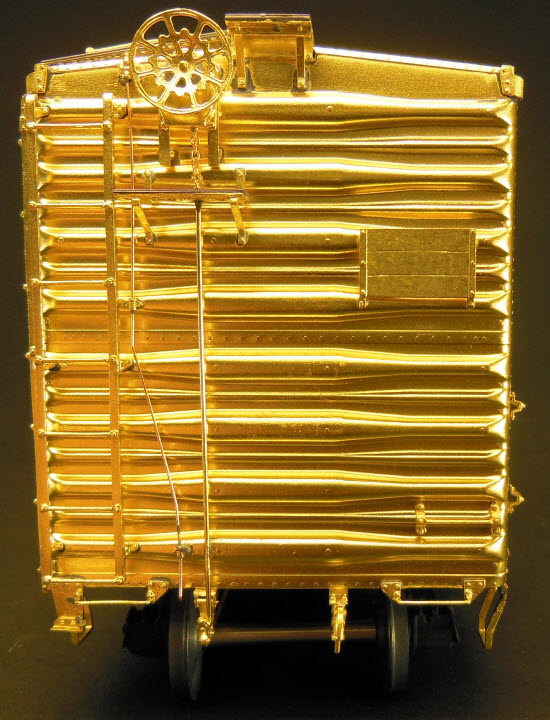 In February 1947, the SSW received an additional 150 40’ double-door autocars built in their Pine Bluff, Arkansas shops, as Series 46300-46449. These cars were 10’-6” IH and had the new Improved Dreadnaught 4/4 ends, Ajax hand brake assemblies, Morton running boards and 3/3/3 lightweight Youngstown 14’ doors, and A-3 Ride Control trucks (model rolls on ball bearings with sintered smooth back steel wheels) Beautifully built in all brass by master builder BooRim Precision of Korea. Correct decals are available from Protocraft Decals Part #SSW-7b.